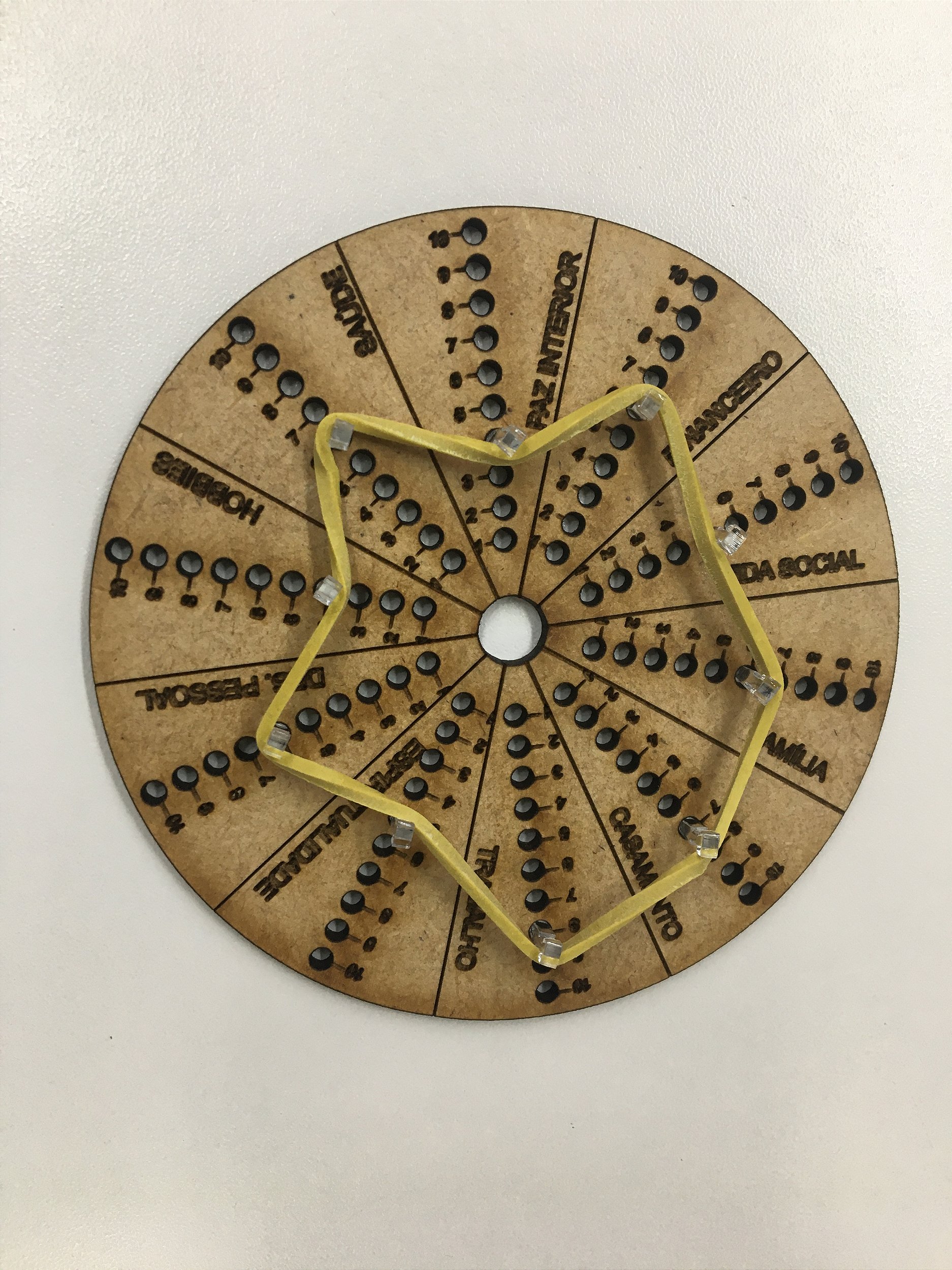 Roda da vida em MDF. Produto voltado para o usuário conseguir mensurar como estão as áreas da vida e decidir com maior precisão em quais áreas deve colocar mais energia com o intuito de gerar um equilíbrio entre todas as 10 áreas da vida.
